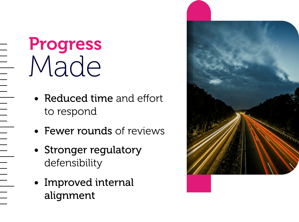 Centralized documentation replaces fragmented, manually updated materials with consistent, system-generated evidence. This strengthens regulatory defensibility while accelerating procurement responses and sales cycles.